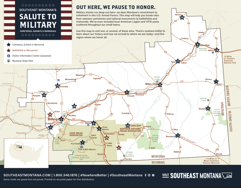 Not sure where to begin? View our Southeast Montana History Map which lists more than 30 cemeteries, exhibits and memorials across the region that honor the military and our country’s history.